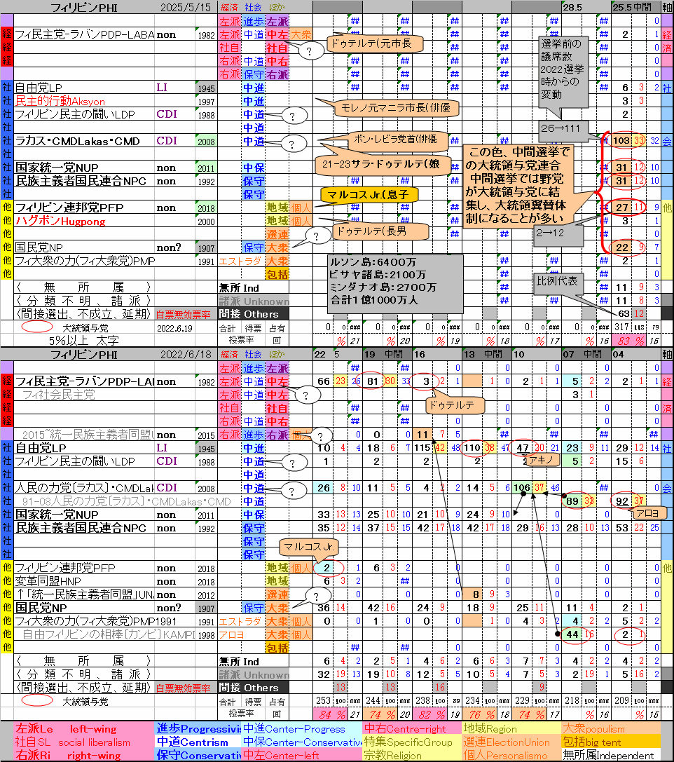 ![]() 並立制(小選);得票率 大統領所属政党 マルコスJr. フィリピン連邦党PFP ドゥテルテ フィ民主党‐ラバンPDP-LABAN ベニグノ・アキノ3世 自由党LP1945 アロヨ(両方に所属?) 91-08人民の力党〔ラカス〕・CMDLakas・CMD 自由フィリピンの相棒〔カンピ〕KAMPI エストラダ フィ大衆の力(フィ大衆党)PMP1991 |